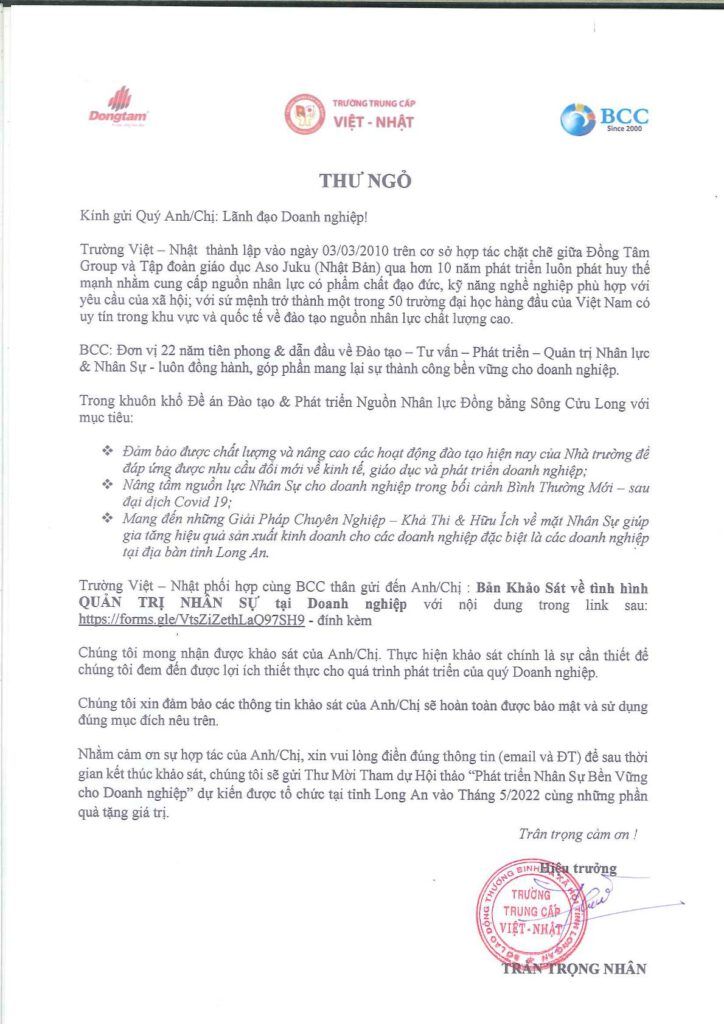 Kính gửi: Quý Anh/Chị lãnh đạo Doanh Nghiệp; Trường Trung cấp Việt – Nhật được thành lập vào ngày 03/03/2010, trên cơ sở hợp tác chặt chẽ giữa Đồng Tâm Group và Tập đoàn giáo dục Aso Juku ( Nhật Bản ). Nhằm mang lại lợi ích thiết thực cho Quý Doanh nghiệp, Trường Trung […]