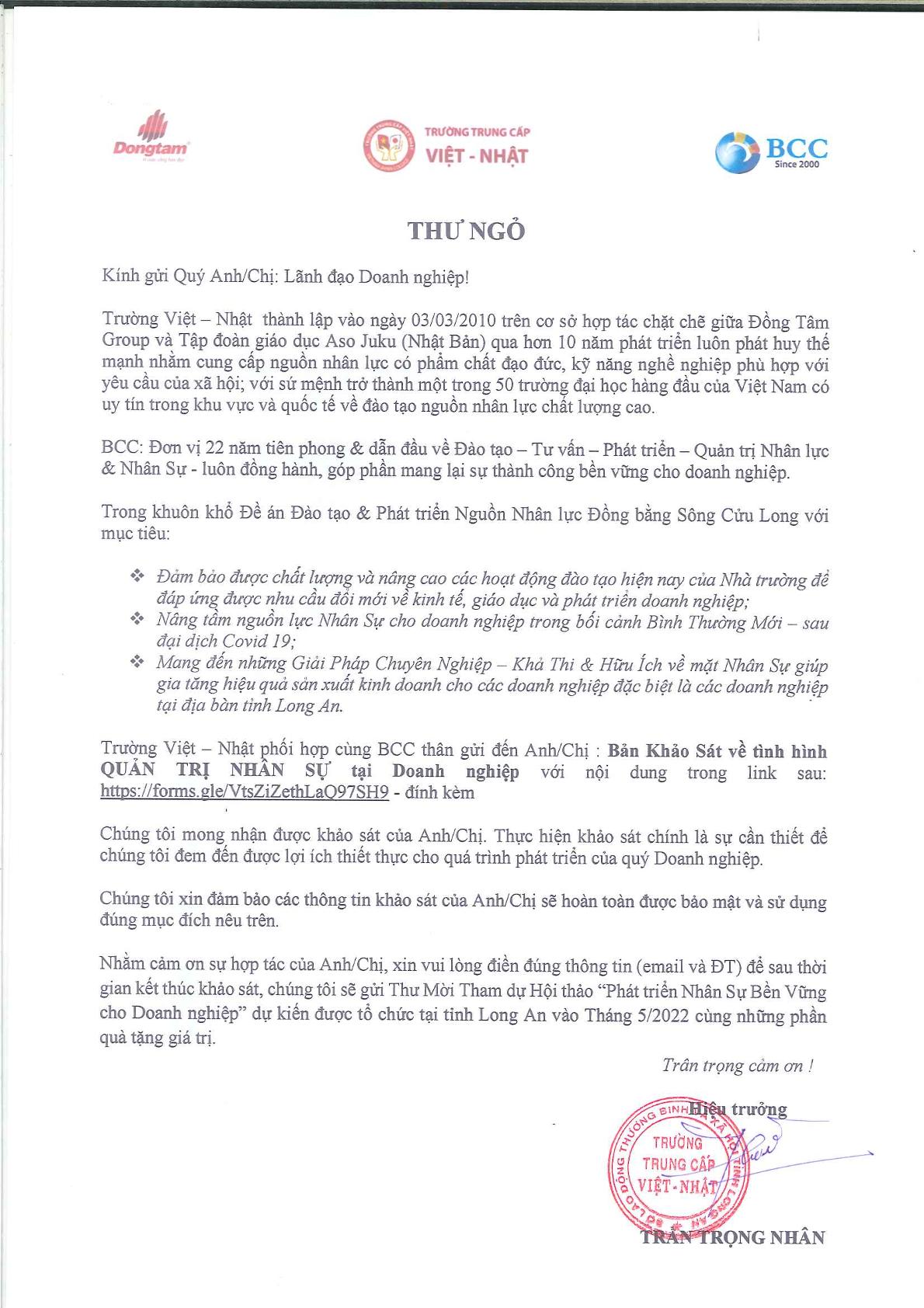 Nhằm mang lại lợi ích thiết thực cho Quý Doanh nghiệp, Trường Trung cấp Việt – Nhật phối hợp với Trung tâm đào tạo & Quản trị nhân sự BCC gửi đến Quý Doanh Nghiệp “PHIẾU KHẢO SÁT VỀ TÌNH HÌNH QUẢN TRỊ NHÂN SỰ TẠI DOANH NGHIỆP”.